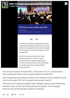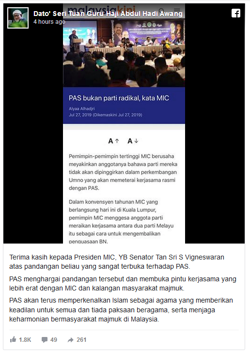 Presiden PAS pada hantaran Facebooknya hari ini turut menyertakan pautan berita Malaysiakini yang melaporkan kenyataan kepimpinan tertinggi MIC itu, sambil menzahirkan penghargaan kepada Vigneswaran.