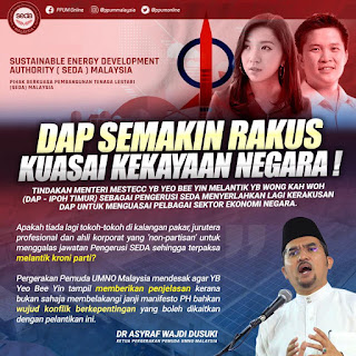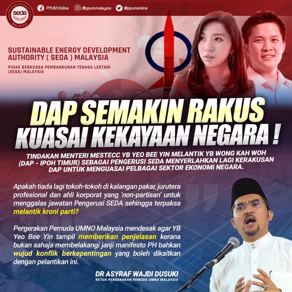 1. Pergerakan Pemuda UMNO Malaysia memandang serius tindakan Menteri MESTECC YB Yeo Bee Yin untuk melantik YB Wong Kah Woh (DAP - Ipoh Timur) sebagai Pengerusi Pihak Berkuasa Pembangunan Tenaga Lestari (SEDA). Keputusan ini secara jelasnya menyerlahkan lagi kerakusan DAP untuk menguasai pelbagai sektor ekonomi negara!