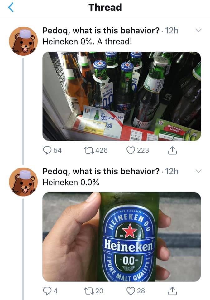 Lebih teruk, ciapan tersebut dah diulang kicau ratusan kali oleh ribuan pengikutnya dan lebih menakutkan, ramai followers bangang dia yang looking forward to try Heineken 0.0 tu. Aduh.