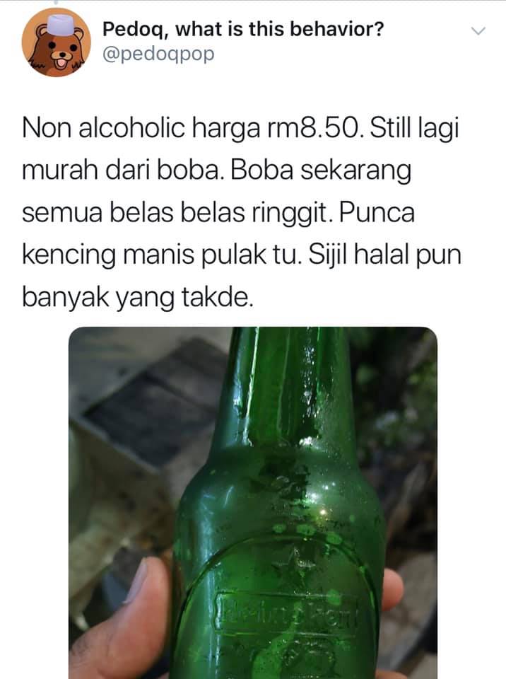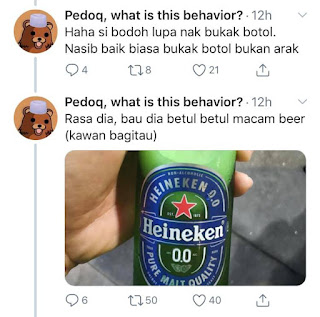 Bukak Twitter hari ni, ada Twitfamous Muslim buat review dan duduk promote Heineken 0.0 kat followers dia. Bangga betul dia review, sampai cakap Heineken tu lagi murah, kurang gula dan lagi sedap dari bobba tea.