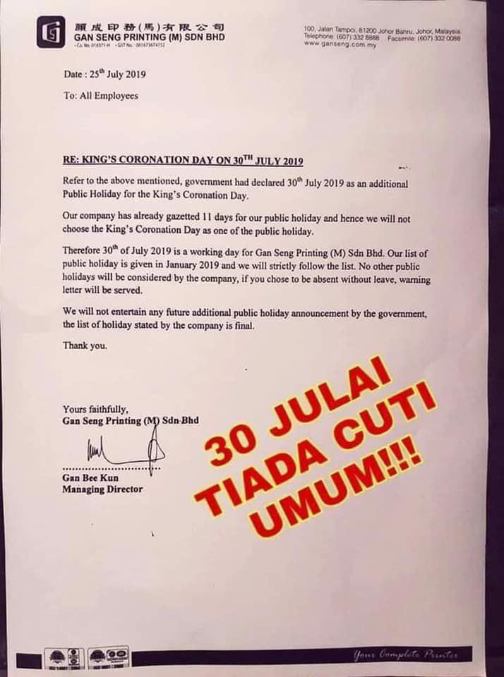 Dalam memo itu, syarikat berkenaan menegaskan bahawa hari cuti umum untuk tahun ini sudah ditetapkan untuk 11 hari dan ia "tidak akan menganggap Hari Pertabalan Agong sebagai cuti umum".