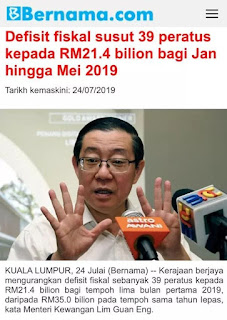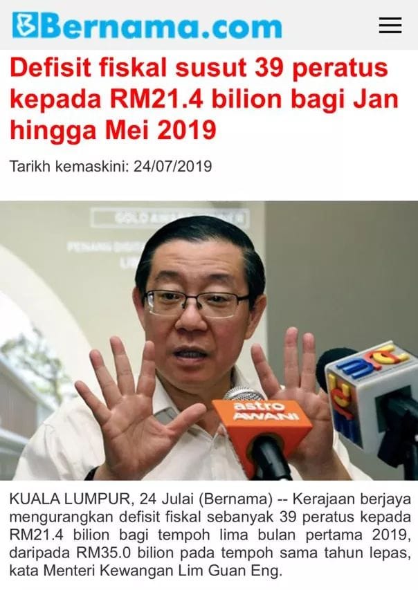 Guan Eng mengeluarkan siaran media hari ini bahawa defisit kerajaan telah jatuh 39% kepada RM21.4 bilion bagi tempoh lima bulan pertama 2019, daripada RM35.0 bilion pada tempoh sama tahun lepas.