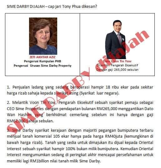 Pada masa yang sama, Lim Guan Eng yang mengetuai Kementerian Kewangan sedang berusaha mendapatkan keluluasan Lembaga Pengarah untuk melupuskan tanah-tanah Sime Darby kepada syarikat-syarikat milik Cina.