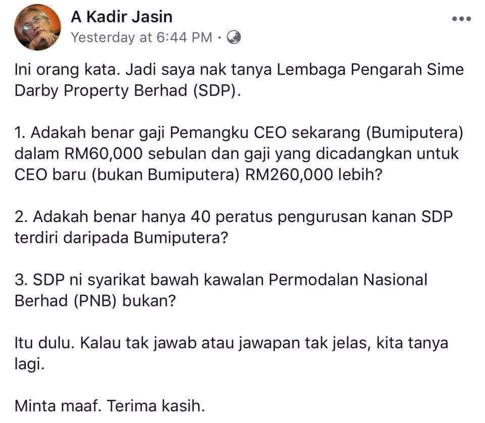A KADIR JASIN ni bekas ketua pengarang Kumpulan The New Straits Times Press (M) Bhd. Beliau kini bergiat dalam Bersatu sebagai pimpinan pusat parti itu. Dia juga penasihat kepada dr Mahathir Mohamad dalam beberapa isu politik. Antara orang yang banyak bersuara dalam isu-isu negara.