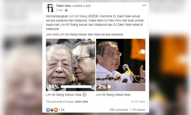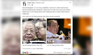 “Memandangkan Lim Kit Siang meminta Dr. Zakir Naik keluar secara sukarela dari Malaysia, maka kami di Fakir Ilmu hendak buat undian, siapa hendak Lim Kit Siang keluar dari Malaysia dan Dr. Zakir Naik kekal di Malaysia,” menurut keterangan undian tersebut.