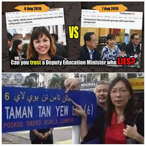 Hari ini pula, Menteri kasut hitam dalam sidang media menyatakan ‘’PENGENALAN TULISAN KHAT INI DILAKSANAKAN SECARA PILIHAN DENGAN GURU DIBERIKAN KUASA UNTUK MEMBUAT KEPUTUSAN MENGENAI KAEDAH PELAKSANAANNYA DI BILIK DARJAH MASING-MASING’’. Ini bermakna guru perlu mengajar tulisan khat dengan menggunakan pendekatan masing-masing. Manakala Timbalan Menteri pula dalam FB beliau memesongkan ayat tersebut dengan berkata PENGAJARAN SENI TULISAN KHAT DILAKSANAKAN SECARA PILIHAN dan guru boleh memilih samada mahu mengajar atau tidak. Ini satu lagi bukti hipokrit pemimpin PH yang bermuka-muka dan memberi definisi berbeda untuk masyarakat berlainan kaum.