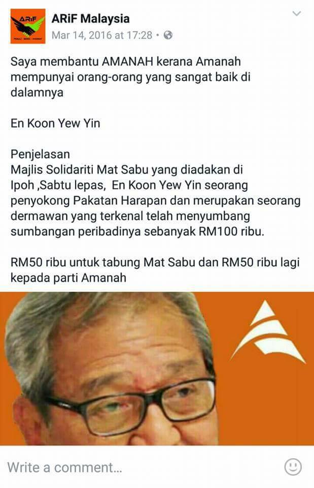 Tahun lepas ARIF AMANAH (PAN) mendedahkan Koon Yew Yin membantu lagi tabung-tabung AMANAH sebelum ini.
