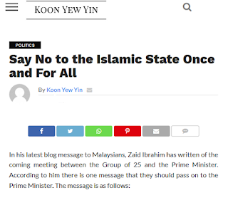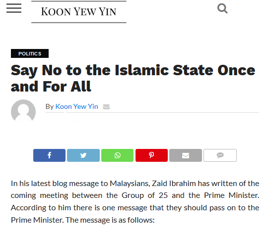 Koon Yew Yin seorang dermawan antara mereka yang terbabit dalam usaha memastikan Malaysia tidak mengamalkan undang-undang Islam. Jika anda baca artikel di lamannya dia dengan jelas menulis "Say No to the Islamic State Once and For All". (Jarang dermawan ada laman sendiri untuk menyampai idea dan pemikiran melainkan dia serius dengan cita-citanya ... no Islamic State)