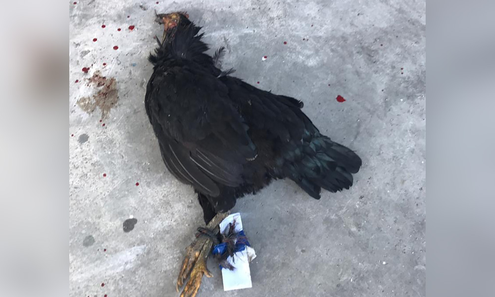 Selain itu seekor bangkai ayam beserta mesej ugutan turut diletakkan di depan pintu.