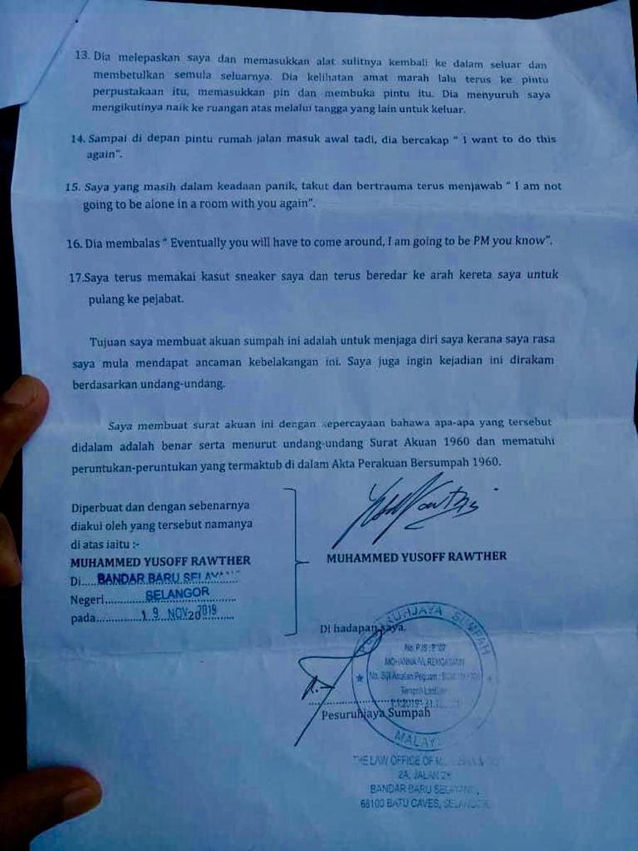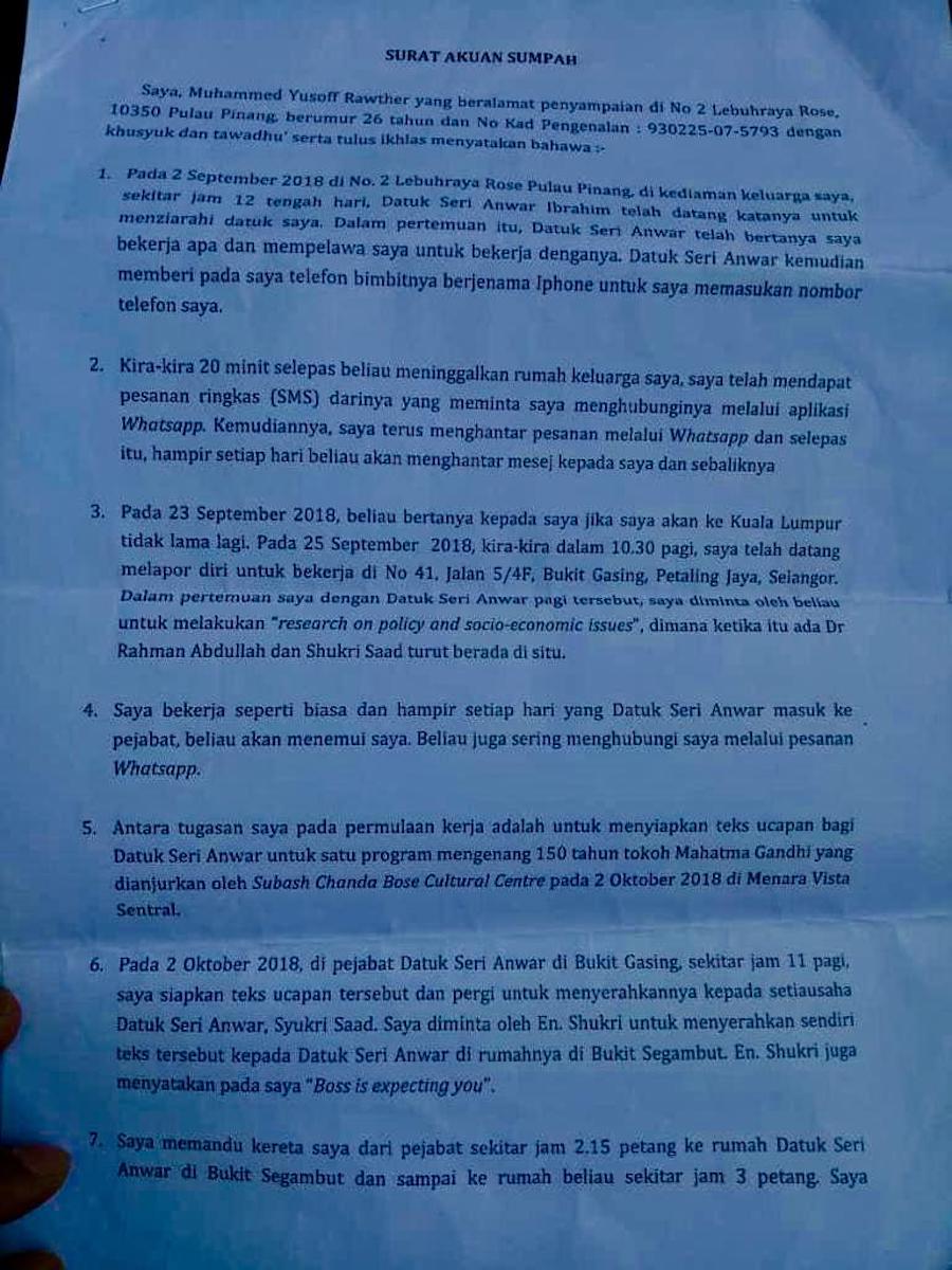 Menerusi satu akuan bersumpah bertarikh 19hb November 2019, Muhammed Yusoff Rawther (kemudian daripada ini dirujuk sebagai “Yusoff”) mendakwa telah diarahkan oleh setiausaha Anwar, Sukri Saad, untuk berjumpa Anwar di kediamannya di Bukit Segambut sebelum diperlakukan dengan cara tidak senonoh.