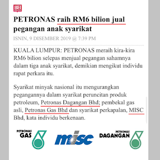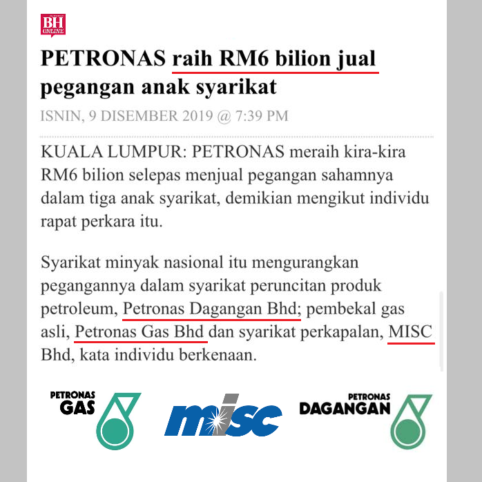 5. Petronas jual pegangan mereka dalam Petronas Gas Bhd, Petronas Dagangan Bhd dan MISC Bhd dengan nilai RM6 bilion.