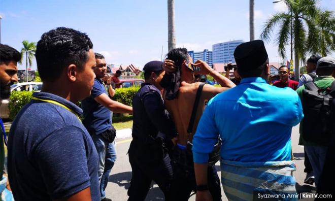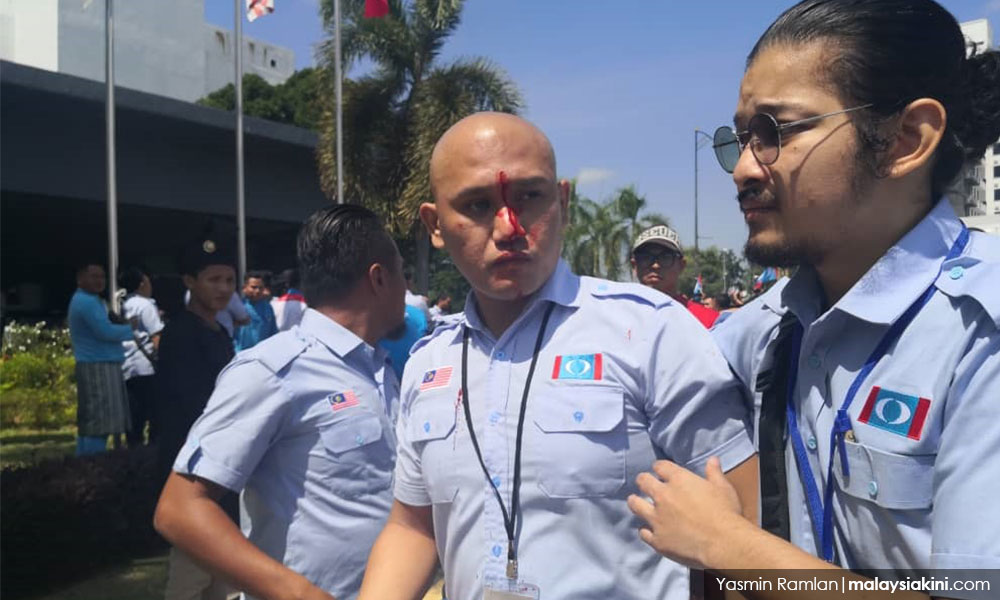 Seorang anggota PKR dilihat berdarah di hidung. Ada yang mendakwa kecederaan itu akibat ditumbuk, sementara dakwaan lain berkata ia akibat batu yang dilempar.
