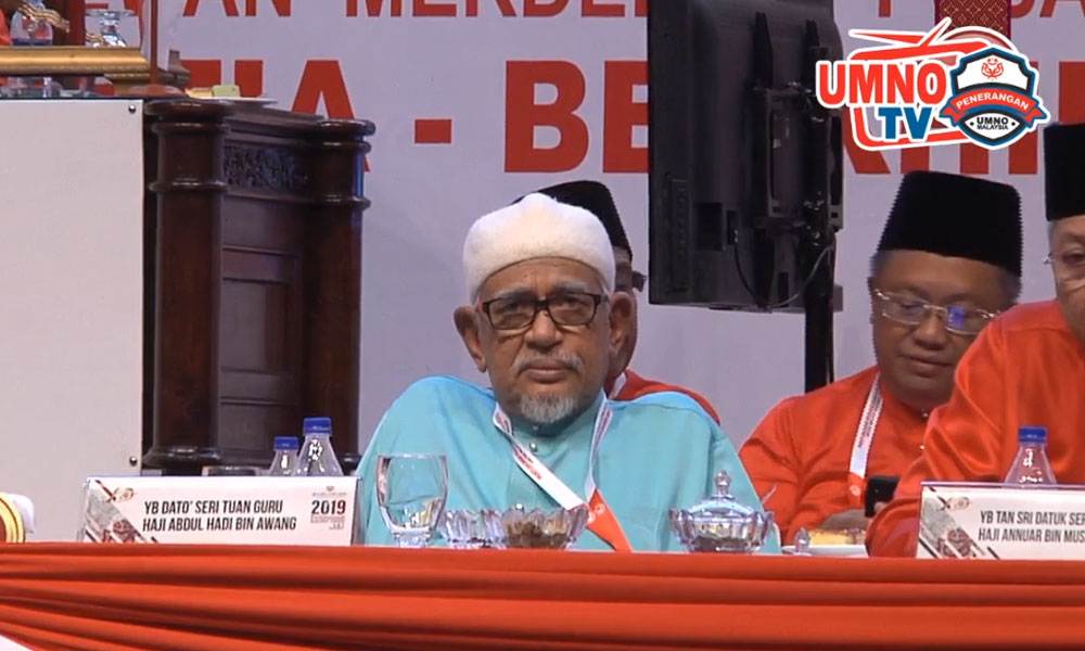 "Umno ingin mengalu-alukan kehadiran murabbi ummah Tuan Guru Haji Abdul Hadi Awang yang hadir buat pertama kali ke perhimpunan agung Umno bersama 30 anggota Jawatankuasa Pusat PAS, pimpinan Dewan Pemuda, Dewan Muslimat dan Dewan Ulamak.