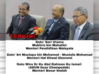 KUALA LUMPUR - Datuk Seri Mukhriz Mahathir dilantik sebagai Menteri Pendidikan manakala Ahli Dewan Undangan Negeri (ADUN) Guar Chempedak, Datuk Dr. Ab. Rahman Ku Ismail menggantinya sebagai Menteri Besar Kedah yang baharu?