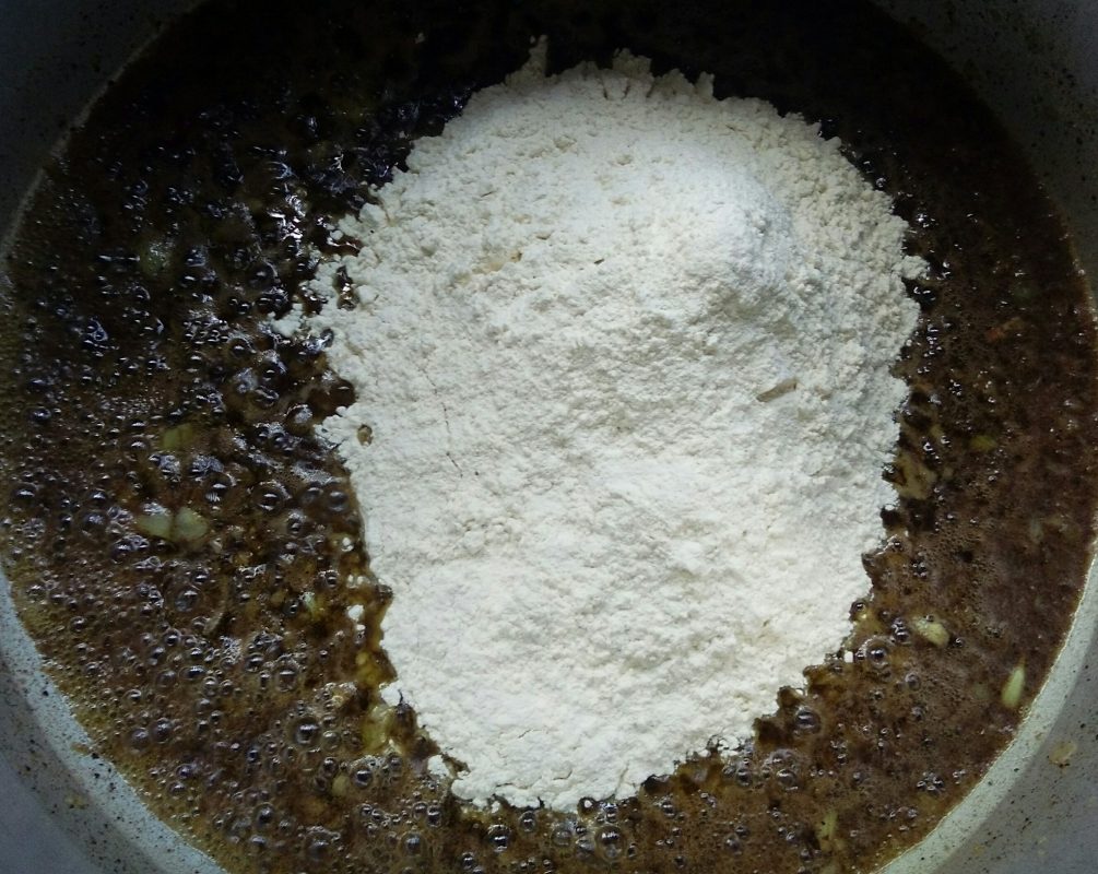 3. Seterusnya masukkan tepung gandum. Perlahankan api. Gaul sehingga sekata supaya tepung tidak berketul-ketul.