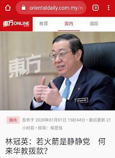 Inilah kata-kata berunsur riak dan bongkak Lim Guan Eng yang disiarkan oleh akhbar Cina, Oriental Daily, semalam, 1 Januari 2020: