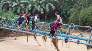 Biarpun meniti jambatan besi usang, di bawahnya arus sungai yang deras dan dalam, semuanya alah bisa tegal biasa. Apakah ada yang mempeduli nasib mereka, di kawasan terpencil di Kota Marudu, Sabah.