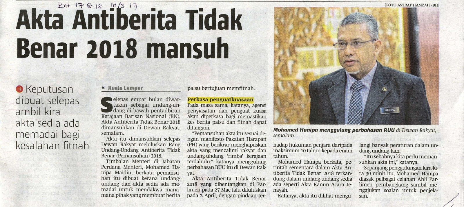 Apakah kita tidak terfikir, apakah tujuan sebenar pentadbiran Dr. Mahathir bersungguh-sungguh mahu memansuhkan Akta Anti Berita Palsu?