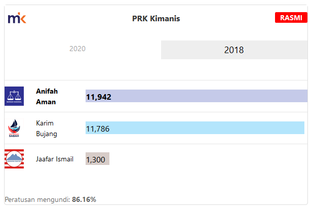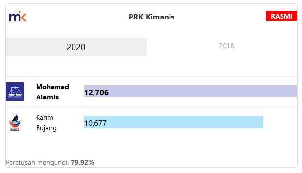 Wakil rakyat BN, Mohamad Alamin menjadi pemenang pilihan raya kecil Kimanis dengan majoriti selesa sekitar 2,029 undi, jauh lebih besar daripada kemenangan tipis 156 undi yang diraih Anifah Amin ketika pilihan raya umum ke-14 pada 2018.