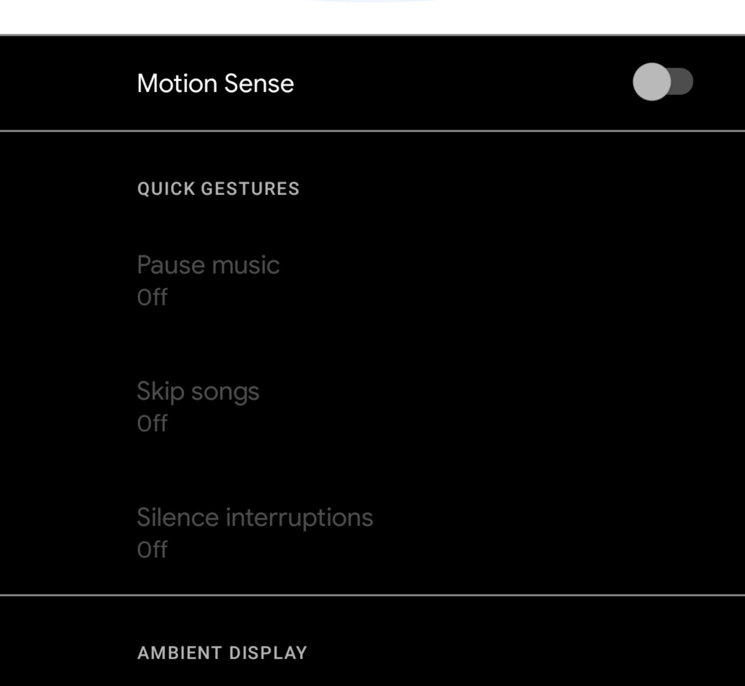 Motion Sense adalah satu fungsi kawalan gestur atas udara yang diperkenalkan pada Pixel 4. Ia menggunakan cip radar yang dinamakan Soli dan pengguna hanya perlu gerakkan tangan seakan Jedi dalam Star Wars untuk mengawal muzik atau mematikan penggera. Cuma dalam versi awal, hanya langkau/kembali sahaja yang boleh dilakukan dalam peranti.