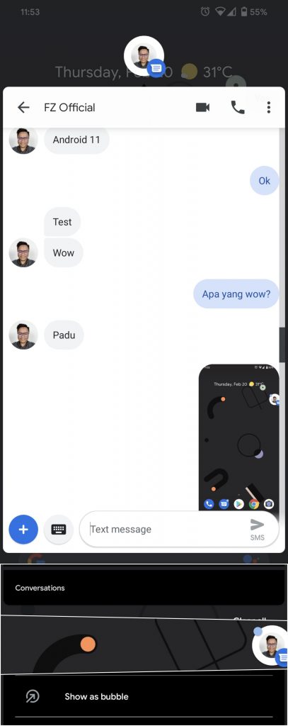 Fungsi ini turut digabungkan dengan Conversation yang mana adalah kategori baharu dalam talam notifikasi. Pengguna kini boleh terus berbalas-balas dalam notifikasi untuk menghantar mesej dan sebagainya. Sudah tentu, ia adalah dalam Bubbles. Kemudian, pengguna turut boleh menghantar fail imej melalui notifikasi - yang mana sebelum ini terhad dengan teks sahaja.
