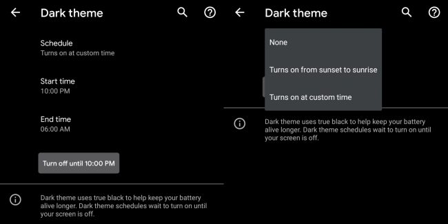 Android 10 adalah dimana bermulanya Google mengambil berat mengenai bateri peranti. Mod tema gelap diperkenalkan agar penggunaan warna pada skrin kurang untuk menjimatkan bateri. Lebih-lebih lagi peranti yang menggunakan skrin AMOLED. Pada Android 10, tema gelap hanya boleh ditetapkan untuk terus kekal atau tema cerah.