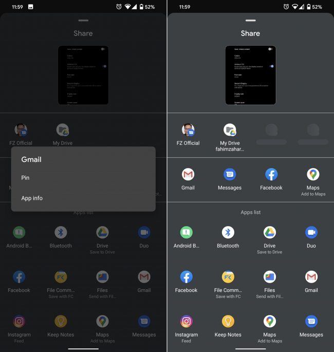Untuk Android 11, apa yang ditiru dari iOS adalah pengguna boleh pin aplikasi kegemaran terus ke bahagian kedua lampiran kongsi ini untuk akses pantas. Ini adalah perkara yang sudah lama diinginkan oleh para pengguna Android. Ini kerana, menatal dalam senarai aplikasi yang banyak untuk kongsi sesuatu adalah melecehkan.