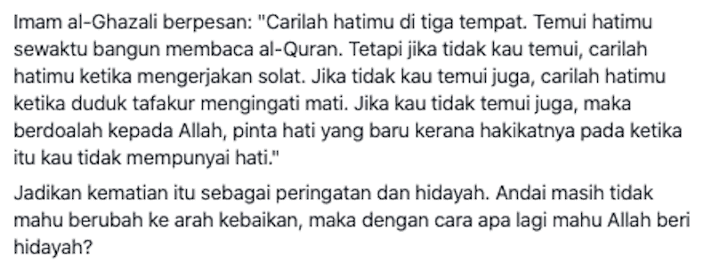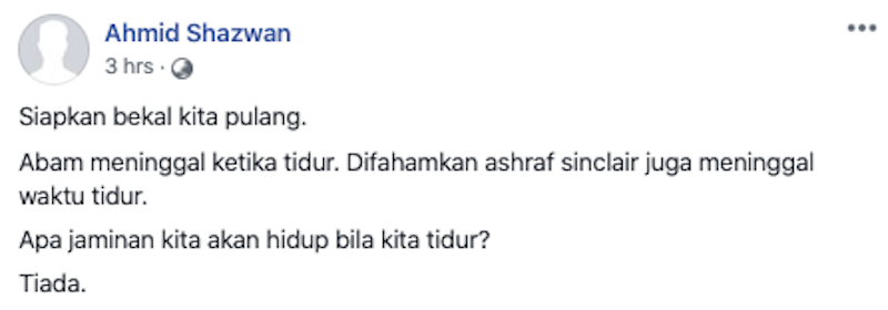 Menerusi laman Facebook pula, seorang netizen Ahmid Shazwan membuat satu perkongsian bagi memperingati insan yang masih bernyawa mempersiapkan diri sepenuhnya untuk bekalan di sana.