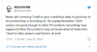 "Berita tentang Tun M (Dr Mahathir) didesak beri tarikh muktamad menyerahkan jawatan perdana menteri terus dilaporkan tanpa henti. "Dengan mengatakan bahawa peralihan kuasa akan berlaku pada Nov 2020 nampaknya tidak cukup bagus untuk pengawas PH.