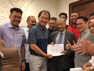 "Buat masa ini kita ada 114 (sokongan), kata Fahmi," katanya ringkas sambil menunjukkan Dr Mahathir Mohamad sedang menyaksikan Ahli Parlimen Selangau, Baru Bian menurunkan tandatangan akuan bersumpah (SD).