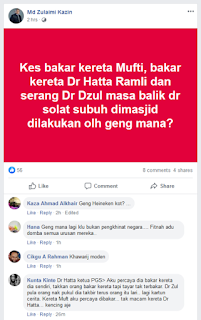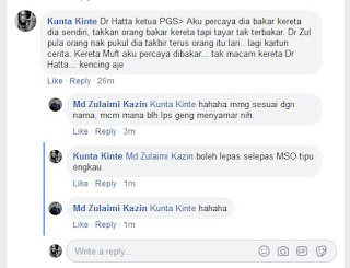 Bila dia post dia atas aku bagi pendapat. Dr Hatta ketua PGS. Aku percaya dia bakar kereta dia sendiri, takkan orang bakar kereta tapi tayar tak terbakar. Dr Zul pula orang nak pukul dia takbir terus orang itu lari.. lagi kartun cerita. Kereta Muft aku percaya dibakar... tak macam kereta Dr Hatta... kencing aje