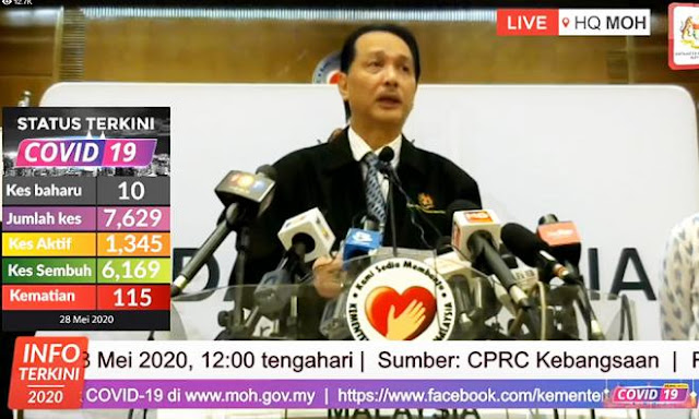 Ketua Pengarah Kesihatan Dr Noor Hisham Abdullah pada sidang akhbarnya di Putrajaya, hari ini berkata sebanyak 10 kes Covid-19 baru dicatatkan, menjadikan jumlah keseluruhan kes jangkitan adalah sebanyak 7,629 kes.