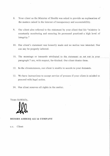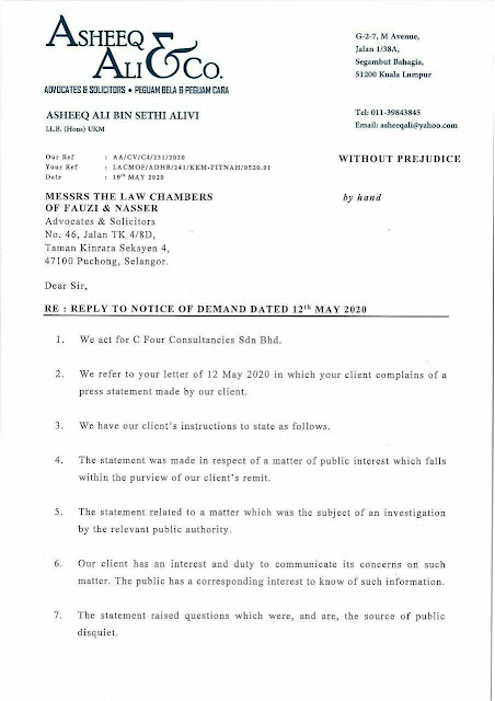 Pada 19hb Mei 2020, C4 Consultansies Sdn Bhd melalui peguam mereka Asheeq Ali and Co telah menjawab surat saman DS Adham Baba. C4 Consultansies tidak akan meminta maaf kepada Menteri Kesihatan DS Adham Baba dan sedia berdepan dengan KKM dan Adham Baba di mahkamah.