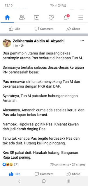 Zolkharnain Abidin Al-Abyadhi buat posting cerita bohong. Katanya pimpinan PAS jumpa Mahathir kerana Mahathir ada 129MP. Dia ingat pemimpin PAS bangang macam pemimpin AMANAH boleh jual agama.