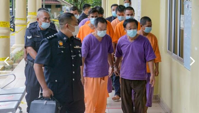Kesemua mereka yang memakai baju lokap polis berwarna oren dan ungu itu, tiba di Kompleks Mahkamah Selayang pada 9 pagi ini, selepas ditahan 11.30 pagi semalam di Rawang, Selangor.