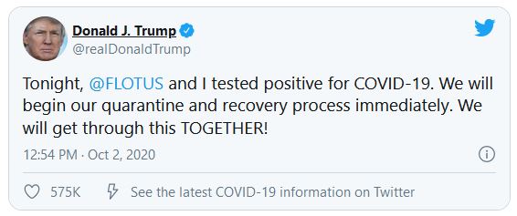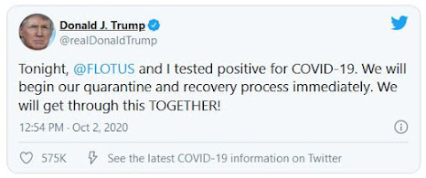 Presiden Amerika Syarikat, Donald Trump hari ini mengumumkan beliau dan isterinya, Melania, didapati positif Covid-19.