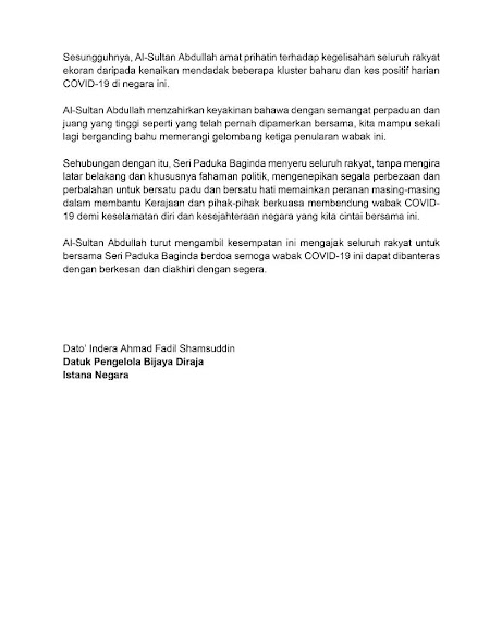 Datuk Pengelola Bijaya Diraja Istana Negara, Ahmad Fadil Shamsuddin, berkata setelah memperhalusi permohonan dan berbincang dengan Raja-raja Melayu serta melihat situasi yang sedang dihadapi oleh negara, Al-Sultan Abdullah berasakan kerajaan sekarang berjaya menangani wabak ini dengan baik dan berkesan.