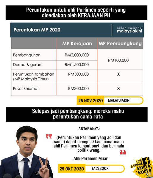 3. Untuk tahun 2020, kerajaan PH naikkan peruntukan kepada ahli Parlimen Kerajaan sehingga RM3.8 juta dan RM4.3 juta (Sabah/Sarawak) seperti yang tertera pada infografik, manakala peruntukan untuk ahli Parlimen Pembangkang, kekal RM100,000.