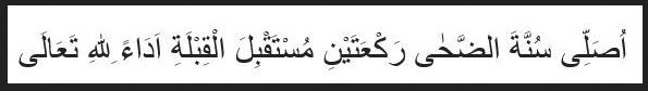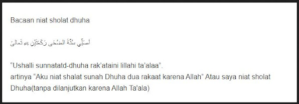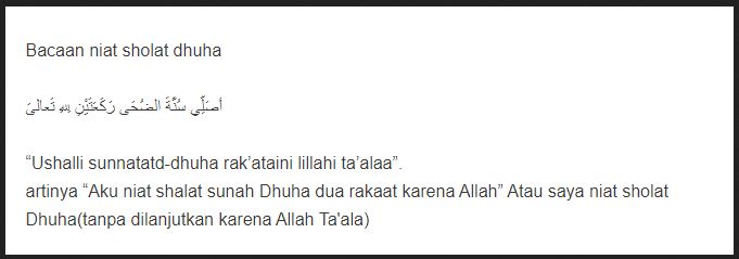 Artinya: “ Aku niat shalat sunnah dhuha dua rakaat menghadap kiblat saat ini karena Allah Ta’ala.”