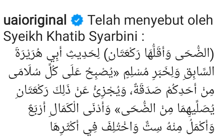 “ Setiap pagi, setiap ruas anggota badan kalian wajib dikeluarkan sedekahnya. Setiap tasbih adalah sedekah, setiap tahmid adalah sedekah, setiap tahlil adalah sedekah, setiap takbir adalah sedekah, menyuruh kepada kebaikan adalah sedekah, dan melarang berbuat munkar adalah sedekah. Semua itu dapat diganti dengan shalat dhuha dua rakaat."