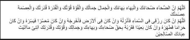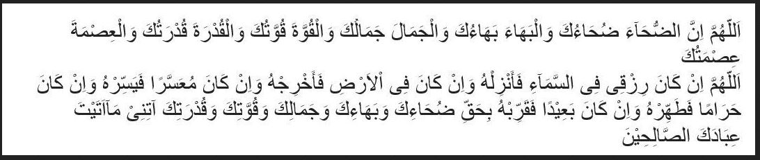 ALLAHUMMA INNADH DHUHA-A DHUHA-UKA, WAL BAHAA-A BAHAA-UKA, WAL JAMAALA JAMAALUKA, WAL QUWWATA QUWWATUKA, WAL QUDRATA QUDRATUKA, WAL ISHMATA ISHMATUKA. ALLAHUMA INKAANA RIZQI FIS SAMMA-I FA ANZILHU, WA INKAANA FIL ARDHI FA-AKHRIJHU, WA INKAANA MU’ASARAN FAYASSIRHU, WAINKAANA HARAAMAN FATHAHHIRHU, WA INKAANA BA’IDAN FA QARIBHU, BIHAQQIDUHAA-IKA WA BAHAAIKA, WA JAMAALIKA WA QUWWATIKA WA QUDRATIKA, AATINI MAA ATAITA ‘IBADIKASH SHALIHIN.