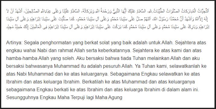 Kesepuluh adalah duduk tasyahud akhir. Duduk ini adalah sujud yang dilakukan di akhir sholat, caranya kaki kiri sedikit dimasukkan lebih ke dalam dan kaki kanan terpancal tegak. Berikut bacaan duduk tasyahud akhir beserta artinya: