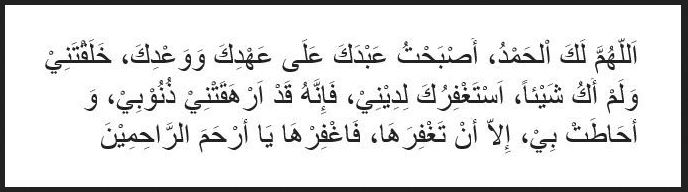 " Ya Allah, bagi-Mu segala puji. Aku memasuki waktu pagi sebagai hamba-Mu untuk memenuhi janji-janji-Mu. Engkau menciptakan aku sementara aku bukan apa-apa. Aku memohon ampunan kepada-Mu untuk agamaku, sesungguhnya dosa-dosaku telah membebaniku dan telah meliputiku kecuali Engkau memaafkannya, maka maafkanlah wahai Dzat paling penyayang di antara para penyayang."