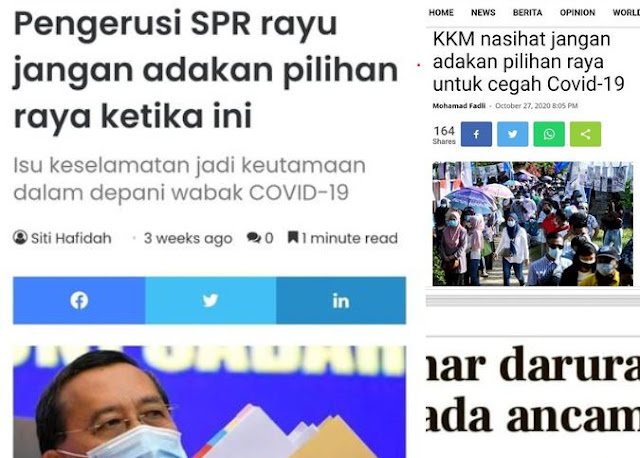 Contohnya ialah Pengerusi Suruhanjaya Pilihan Raya, Datuk Abdul Ghani Salleh, yang dilaporkan pada 13 Oktober lalu “memohon kalau boleh tiada pilihan raya ketika ini" kerana pilihan raya tidak sesuai diadakan pada masa ini berikutan pandemik Covid-19 yang melanda negara.