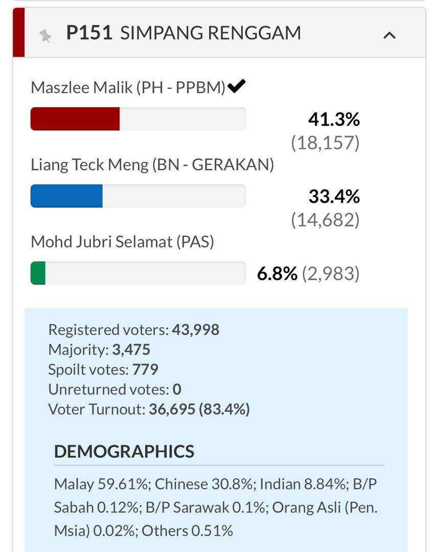 Oleh kerana Dr. Maszlee adalah Ahli Parlimen Simpang Renggam, kerusi yang dimenanginya pada PRU14 lalu mempunyai komposisi pengundi Melayu 59.60%, Cina 30.8%, India 8.84% dan selebihnya adalah kaum-kaum lain, pilihan yang terbaik untuk beliau terus berpeluang cerah mengekalkan kerusinya ialah dengan kembali kepada PH.