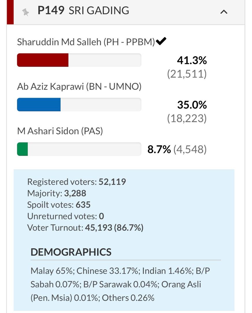 Komposisi pengundi yang hampir sama antara Sri Gading dengan Simpang Renggam itu menunjukkan kekal bersama Pejuang atau menyertai Bersatu bukanlah pilihan untuk Dr. Shahruddin mampu kekal lagi di kerusi tersebut.