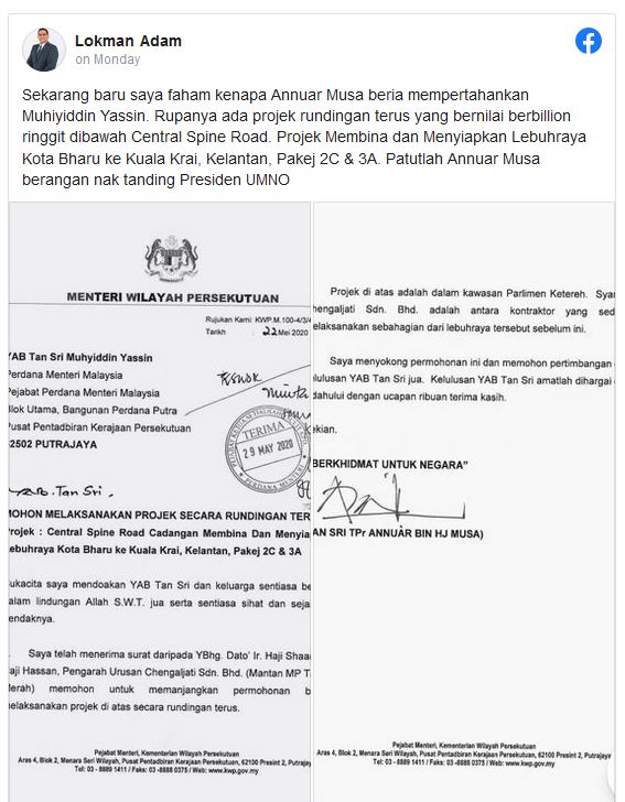 Terdahulu Lokman dalam satu hantaran di Facebooknya mendedahkan 'surat sokongan' Annuar kepada Muhyiddin agar diberikan rundingan terus projek membina dan menyiapkan Lebuhraya Kota Bharu- Kuala Krai (pakej 2C dan 3A) kepada sebuah syarikat.