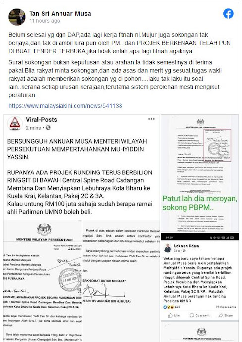 Menteri Wilayah Persekutuan, Annuar Musa tampil memberi penjelasan berhubungan dakwaan ahli Majlis Tertinggi Umno, Lokman Noor Adam mengenai surat sokongan kepada perdana menteri supaya meluluskan projek pembinaan lebuh raya di Kelantan secara rundingan terus kepada sebuah syarikat.