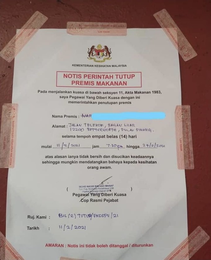 BUTTERWORTH - Sebuah premis nasi kandar di Jalan Telekom, Bagan Luar di sini diarah tutup semalam kerana tidak mematuhi piawai kebersihan yang ditetapkan.