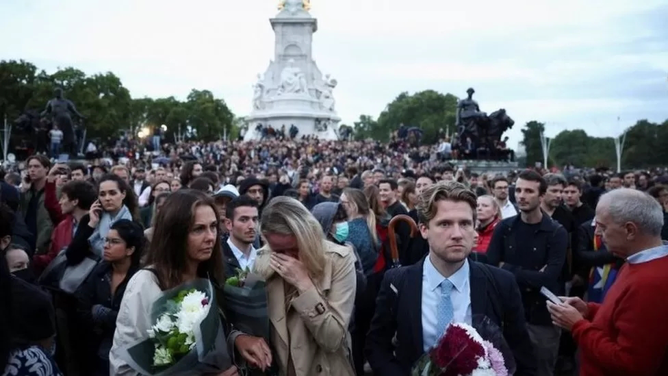 Di Istana Buckingham di London, orang ramai yang menunggu maklumat terkini mengenai keadaan Ratu mula menangis apabila mendengar kematiannya.